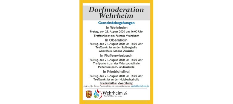 - Wehrheim: Freitag, den 28. August 2020 um 16 Uhr. Treffpunkz ist am Rathaus.
