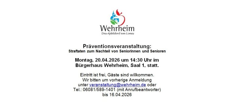 Am Montag, 20.04.2026 findet um 14:30 Uhr im Bürgerhaus Wehrheim, Saal 1, eine Präventionsveranstaltung zum Thema Straftaten zum Nachteil von Seniorinnen und Senioren statt.