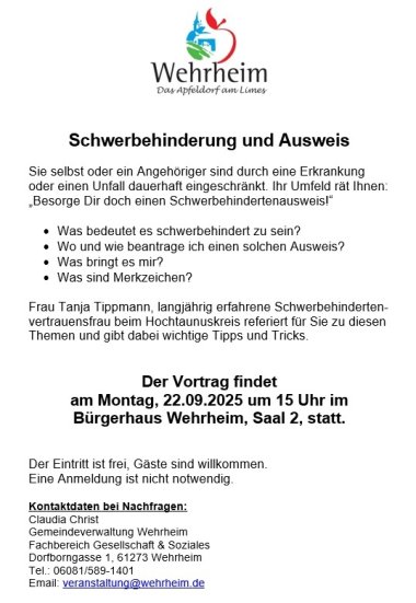 Vortrag zum Thema Schwerbehinderung und Ausweis am Montag, 22.09.2025