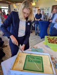 Beim Regionalforum gibt es traditionell einen Käsekuchen mit dem Marzipan-Logo der LEADER-Region Hoher Taunus. Er wird vom jeweiligen Bürgermeister angeschnitten und verteilt. Hier ist Bürgermeisterin Julia Krügers beim Anschnitt des Kuchens vom Café Waldschmitt zu sehen, während draußen begeisterte Kinder den Kletterturm zum Beben brachten.