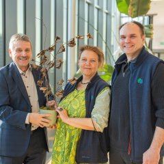 Foto (von links): Mainova-Vorstand Peter Arnold übergibt einen symbolischen Setzling für die Pflanzaktion im Wehrheimer Wald an Kirsten vom Heu, geschäftsführende Vorständin des Trinkwasserwald e.V., und Joachim Dib, Mitglied des Trinkwasserwald e.V.