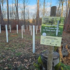 Neue Pflanzen-Schutzhüllen wurden eingebaut. Ein Hinweisschild weist darauf hin, dass das Material zu 100% abbaubar ist unter den Waldbedingungen incl. der Kabelbinder, gepflanzt wurde Douglasie als Nadelholzanteil. Kosten ca. 6,50 Euro/ Stück plus Aufbau, die Pflanze ca. 1,80 Euro/Stück.