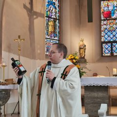 Pfarrer Tobias Blechschmidt hat eine eindrucksvolle Verbindung der Wahrung der Schöpfung mit dem Bogen zum Hl. Hubertus hergestellt, bis hin zum "Jägermeister", auf dem das Kreuz bis heute auf jeder Flasche zu sehen ist.