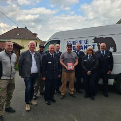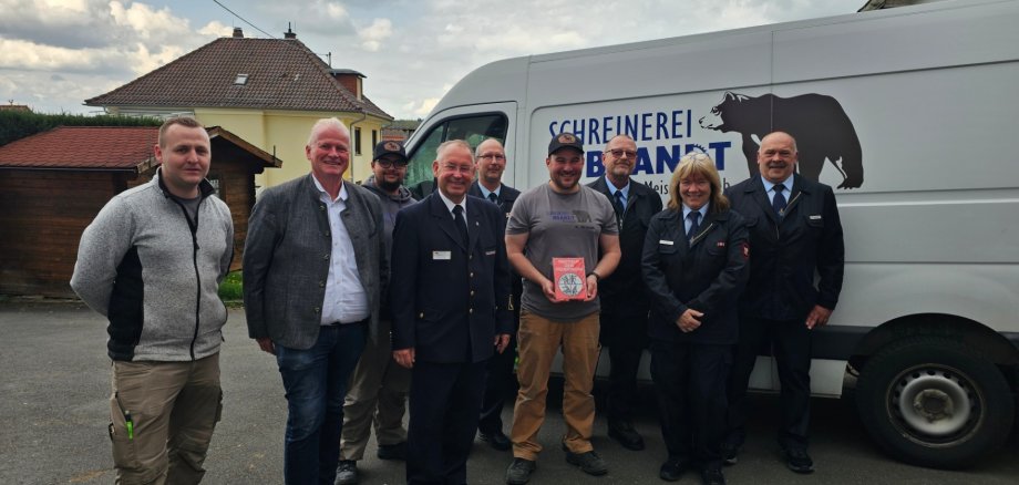 Verleihung der Urkunde und Plakette an die Schreinerei Steffen Brandt im Wehrheimer Ortsteil Friedrichsthal als "Partner der Feuerwehr".